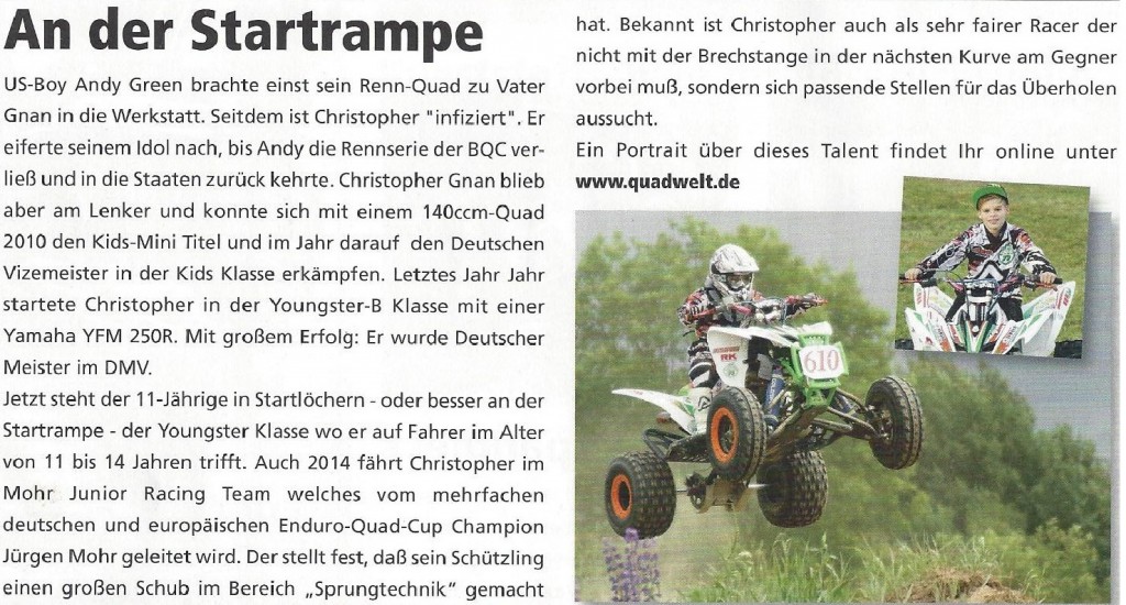 In der Ausgabe der Quadwelt 02/2014 März/April ist ein kleiner Bericht über Christopher. Ralf Wilke (Chefredakteur von Quadwelt) hat auch ein Portrait über Christopher in der Quadwelt online gestellt.
