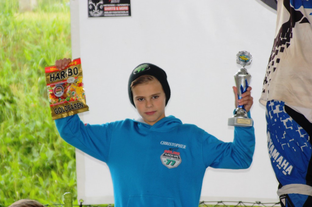 Es ist Rennwochenende und es regnet am Freitag die ganze Nacht, war ja wieder klar. Das erste Training ließ Christopher gerne ausfallen um das Material zu schonen. Das zweite Training konnte dann bis auf ein paar widerspenstige Sumpflöcher durchgeführt werden. Dann war die Startaufstellung wo sich Christopher auf dem 3. Platz stellen mußte. In die erste Kurve kam er als zweiter, konnte aber den Führenden Filip Koutecky schon zwei Kurven später überholen. Leider fädelte Christopher in der zweiten Runde bei einem Baum ein und mußte die Führung wieder abgeben. So blieb es dann bis zum Schluß. Mit dem zweiten Platz im Finallauf konnte sich unser Youngster noch den Vizemeistertitel erkämpfen. Wir sind Megastolz!